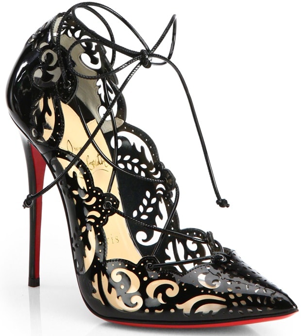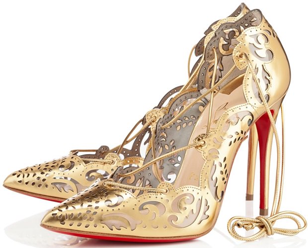 Recently, a new Christian Louboutin style has positioned itself as a celebrity favorite. While not as classic as the Pigalle or the So Kate, we’ve already spotted stars, such as Rihanna, Alessandra Ambrosio, Nina Dobrev, Florence Welch, Rocsi Diaz, and Nicki Minaj, wearing them. We’re talking about the “Impera” pumps, which are part of the brand’s Spring 2014 collection. They feature intricate lace-patterned laser-cut leather with clear PVC inserts, scalloped collars, pointed toes, lace-up vamps, ankle ties, and 4 inch stiletto heels. A number of color variations are available, including white, black, nude patent, and metallic gold specchio.