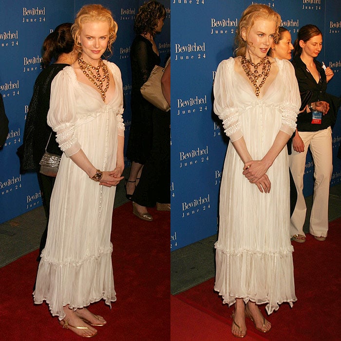 Nicole Kidman channeled the complete opposite of her witchy role in a floaty, white Yves Saint Laurent dress and gold thong sandals at the ‘Bewitched’ premiere.