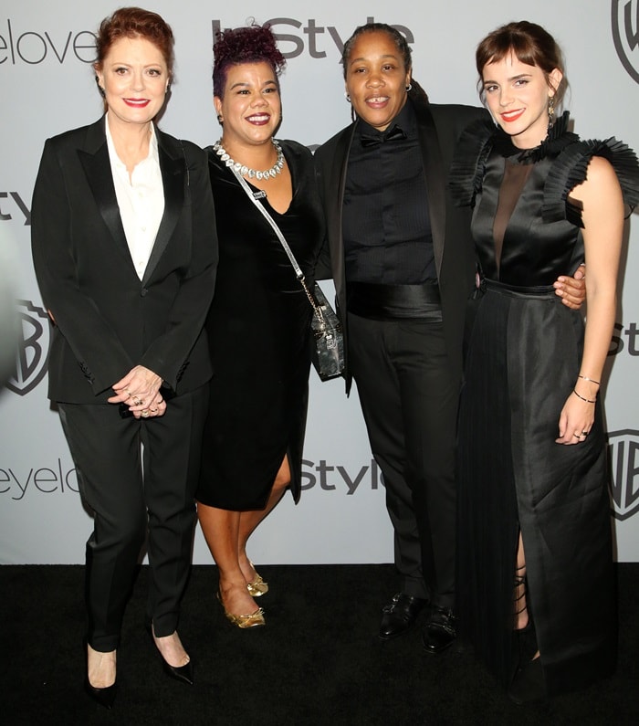 Fashion critics did not like the satin gown from Ronald van der Kemp that Emma Watson wore at the 2018 Golden Globe Awards, which she accessorized with Lilian Von Trapp jewelry and Creatures of Comfort slip-on style flats with a wraparound tie.