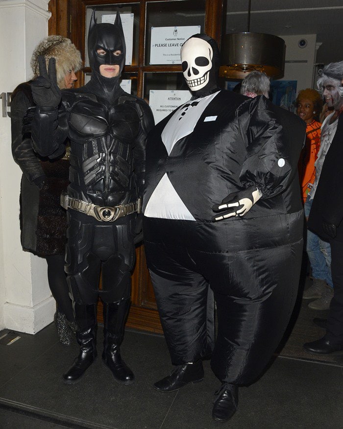 Liam Payne, as Batman, and Tom Daley, in a fat skeleton costume, bring humor and heroism to a Halloween party at Funky Buddha nightclub in London, England, on October 28, 2012 (Credit: Apega / WENN / Andres Otero / Judy Eddy / DJDM / Brian To / Josiah True)