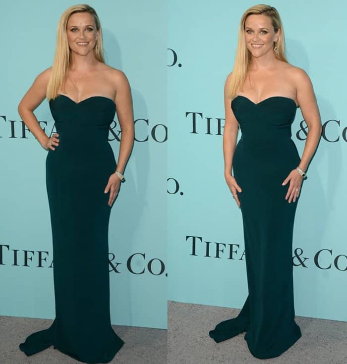 Reese Witherspoon stunned in a strapless emerald Brandon Maxwell gown, accessorized with sparkling Tiffany & Co. diamond jewelry at the Blue Book Gala