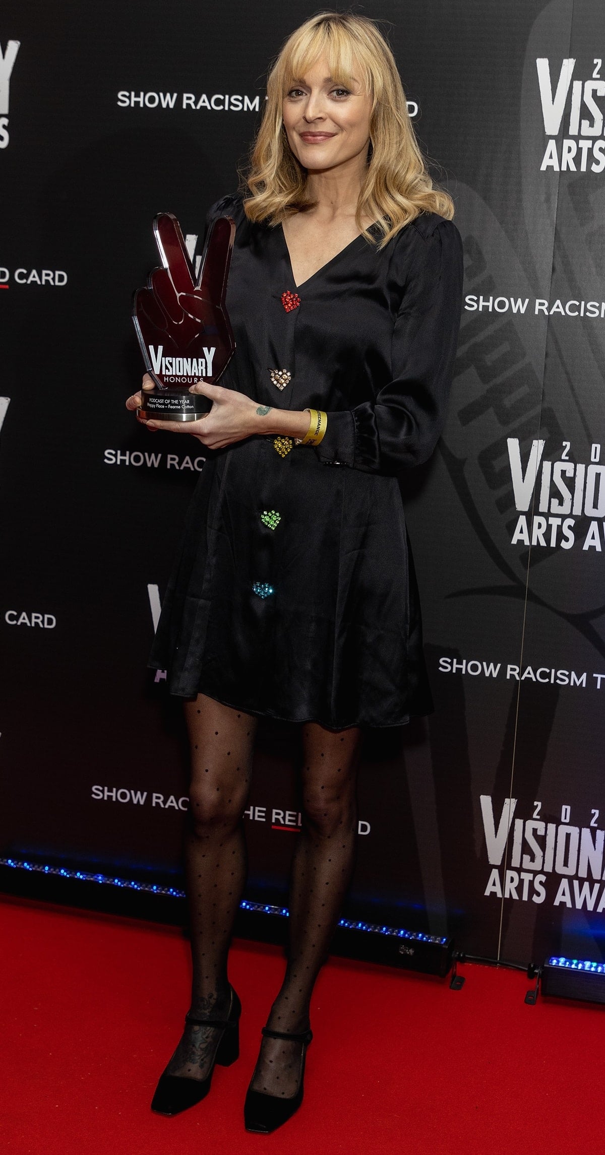 Fearne Cotton stuns in a black satin mini dress with colorful embellishments, polka-dot tights, and classic black Mary Jane heels at the 2023 Visionary Arts Awards at Ham Yard Hotel on March 21, 2023, in London, England (Credit: PA Images / INSTARimages)