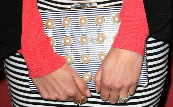 Nikki Reed braved the rain in a Tory Burch cashmere sweater, a pencil skirt from ASOS in monochrome stripes, a gold bump ring by N/Tice, a pearly accented clutch by Kate Spade New York, and Bionda Castana “Rosario” heels.