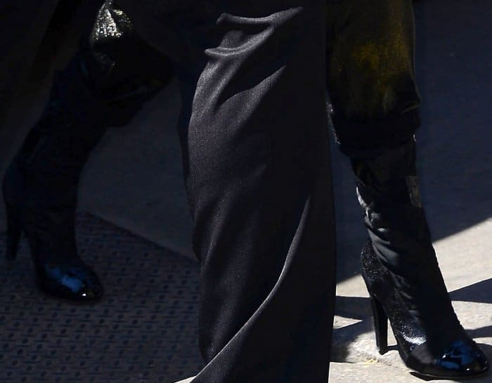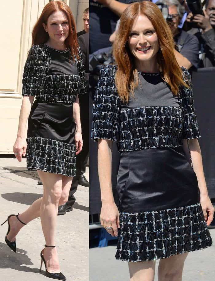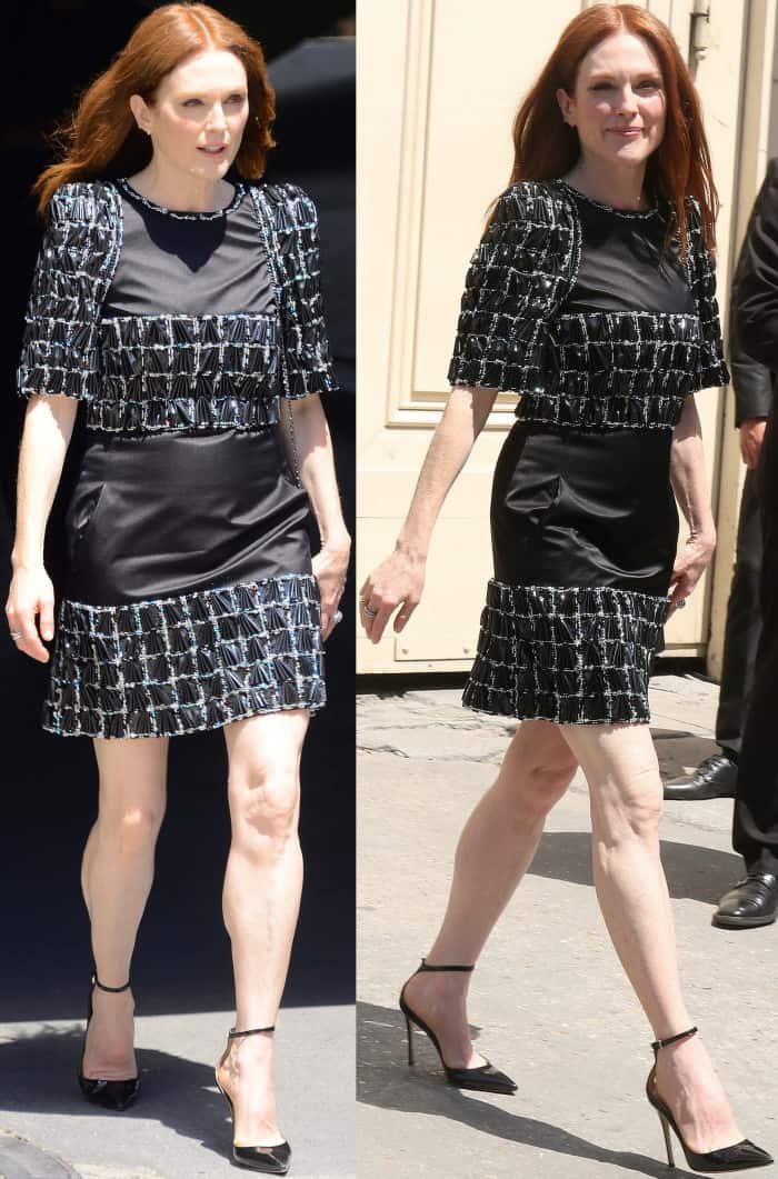 Julianne Moore looked sophisticated in a charming black crepe embellished dress for the occasion. She kept her hair and makeup simple, only opting for glossy lips and slightly tousled waves. Pointy-toe ankle-strap pumps in black patent leather capped off her chic look.