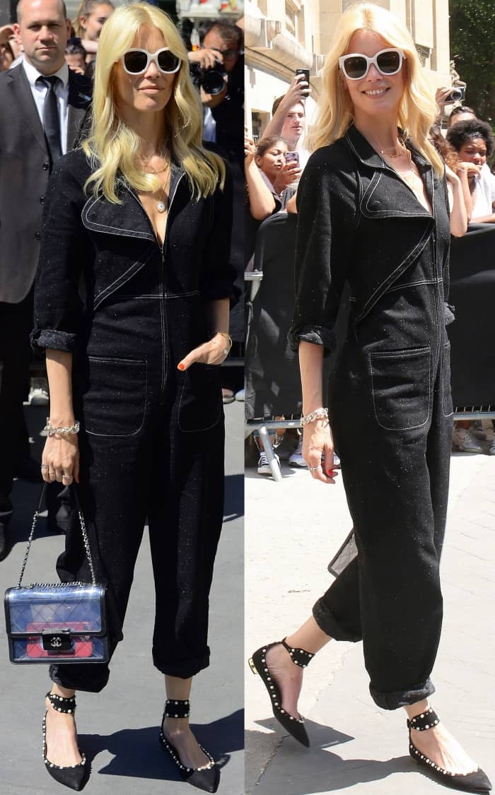 German model and actress Claudia Schiffer opted for a more laid-back approach to her Chanel look with a jumpsuit that featured unevenly rolled-up cuffs. The lax details gave Claudia an effortlessly stylish vibe, which she elevated with retro-style white sunglasses, a translucent bag with a chain strap and studded black flats.