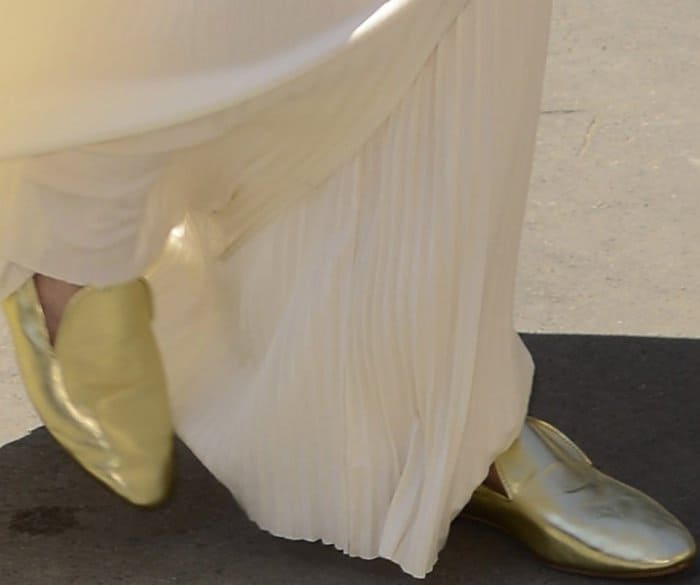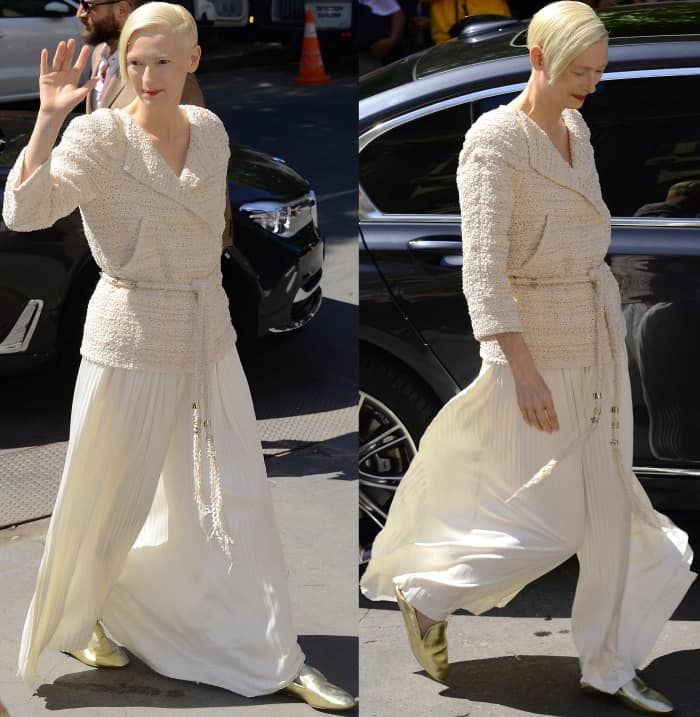 Academy Award winner and fashion muse Tilda Swinton made quite the entrance at the show in a Resort 2018 look comprised of a beige tweed jacket with a belted waist over an ivory plisse skirt with a wide-leg silhouette. She styled it with pink lips, a sleek side-swept bob and metallic gold flats.