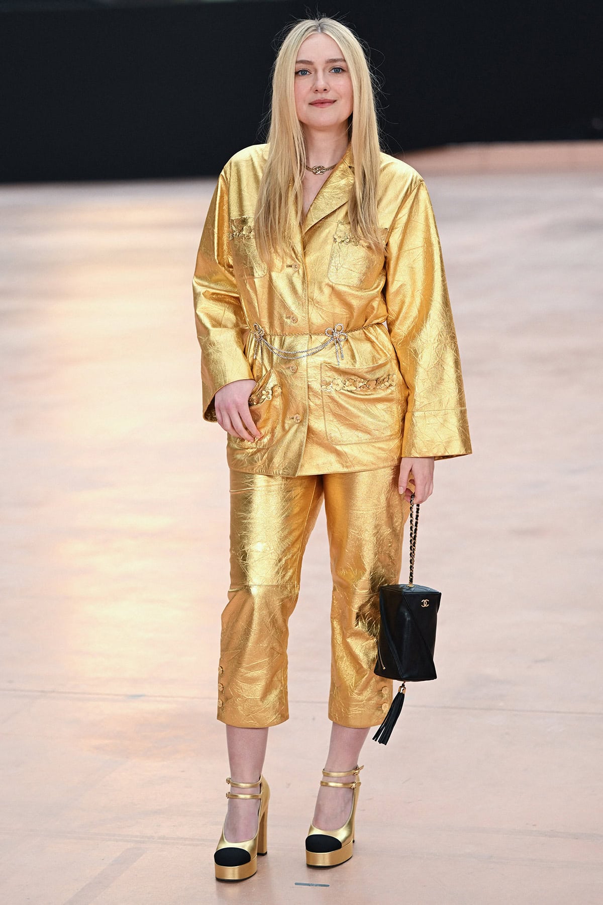 Dakota Fanning stood out among the crowd in a head-to-toe gold look. She made her way to the front row in a pair of pumps similar to Camila’s, but hers was notable for its unique gold and black color scheme.