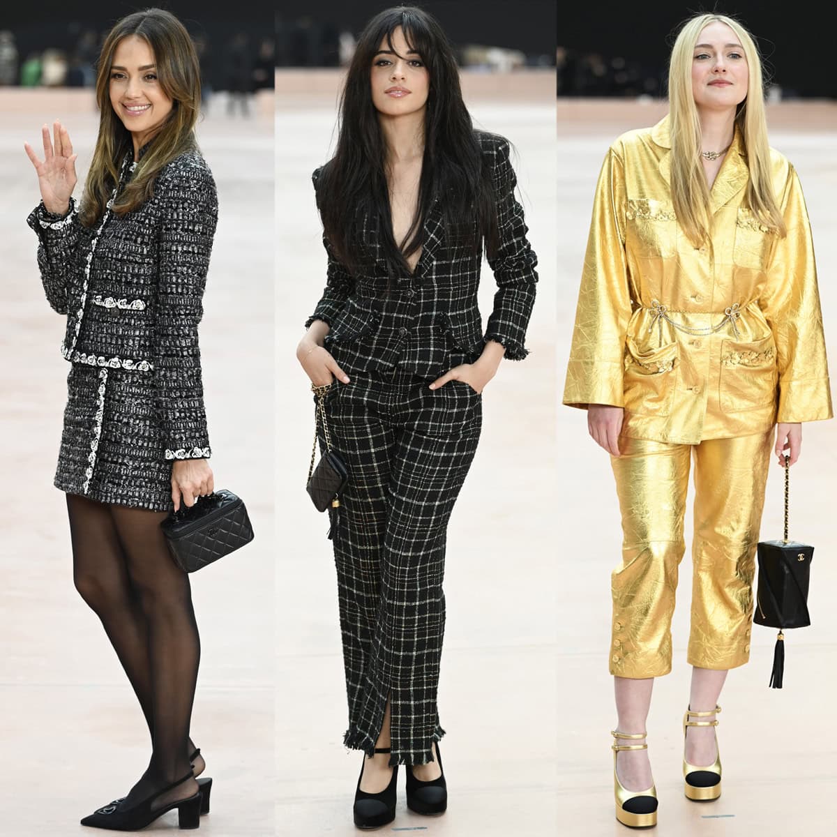 The star-studded front row features Jessica Alba, Camila Cabello, and Dakota Fanning, all dressed to the nines. Dakota’s striking gold satin suit stole the show, while Jessica and Camila went for the classic black tweed look.