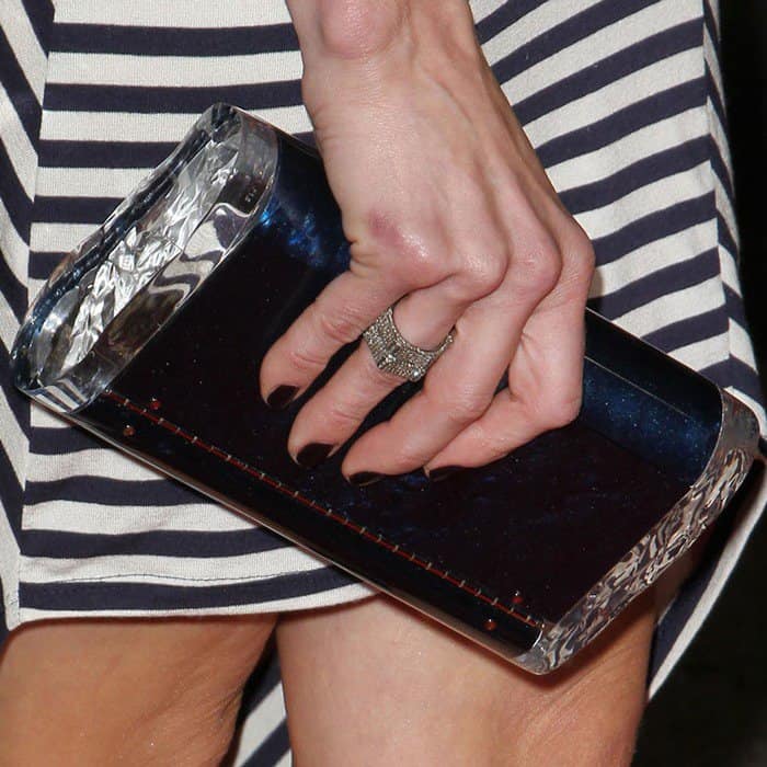 Chelsea Handler elevated her casual striped dress with a sleek navy‑and‑silver box clutch and a pair of standout Gio Diev Nikko II pumps — a statement design from the luxury New York–based footwear brand founded in 2010 by Bulgarian designer Gio Metodiev.
