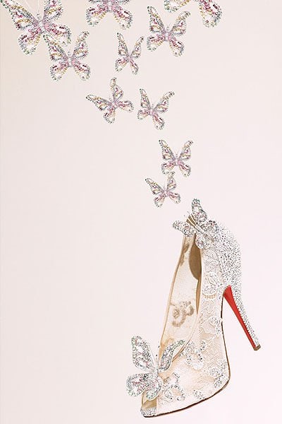 Eschewing actual glass, plastic and lucite — materials which the French shoe connoisseur says “makes a really ugly foot” and “could look very ’60s or sort of punky”, — Louboutin evoked the feeling of lightness in his Cinderella shoe by using sheer white lace. He recreated glass’s sheen and sparkle by encrusting the shoe with Swarovski crystals. Finally, he gave the shoe crystallized butterfly embellishments to represent the delicate creatures surrounding Cinderella as she goes about her daily chores.