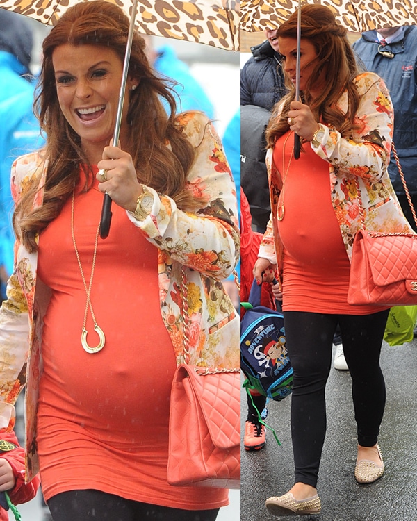 So, there’s Coleen Rooney braving the rain in a bright ensemble, which included an orange top and a floral Zara blazer. It was really a good thing that she wore flats studded with gold spikes as they added edge to her very feminine getup.
