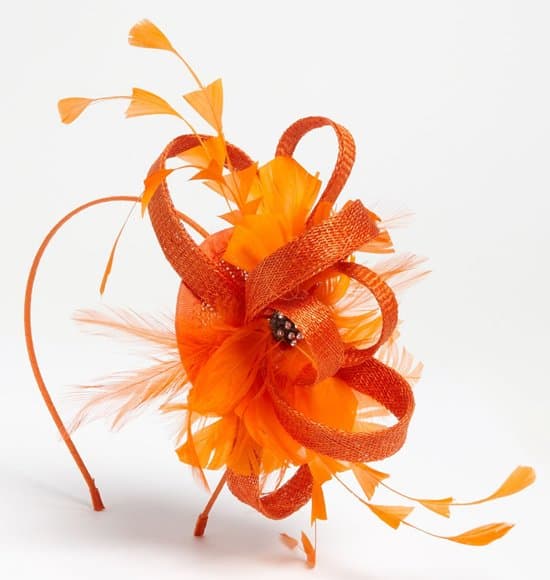 Rhinestones sit atop this orange fascinator, with extensions curling past your head. Striking!