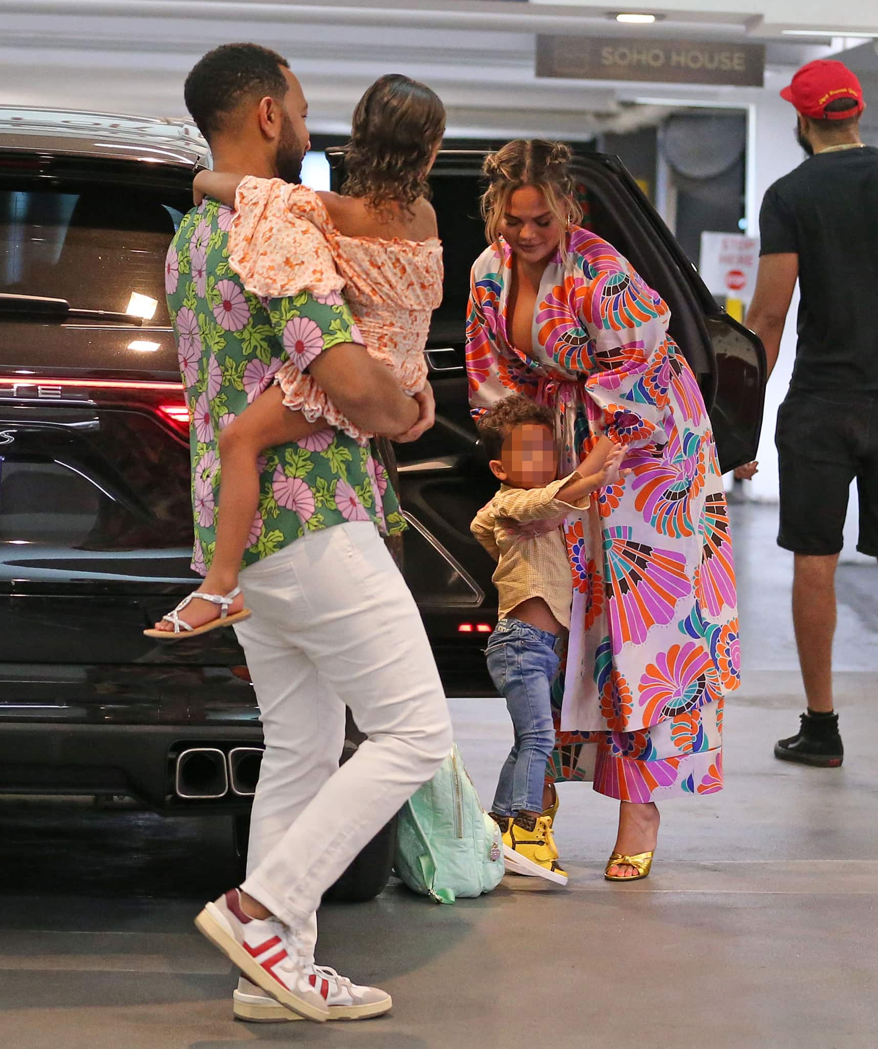 Chrissy Teigen and John Legend take their kids, Lune and Miles, to lunch at Soho House in West Hollywood on June 26, 2021 (Credit: Mega / WENN)