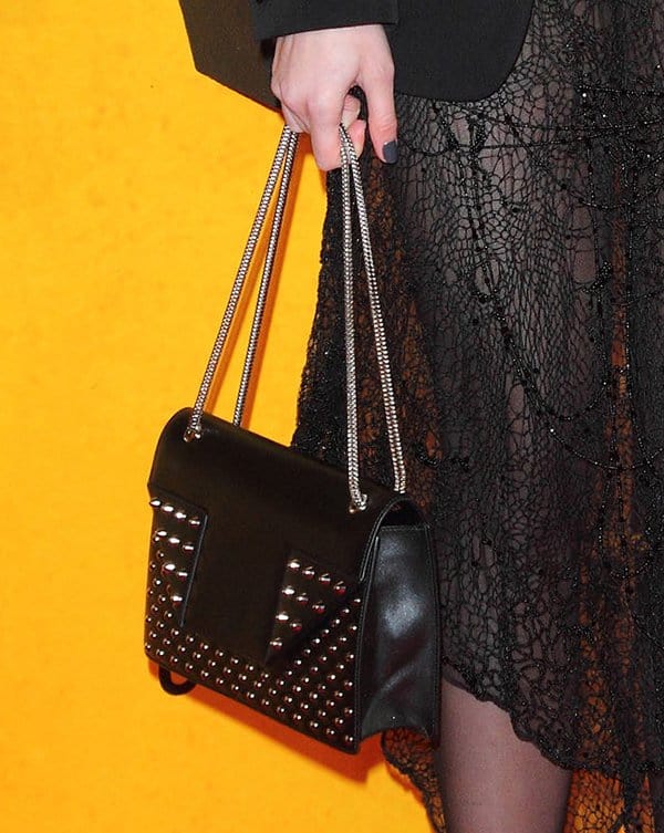 Daisy toted a smooth black leather Saint Laurent “Betty” bag punctuated with spiked silver-tone studs at the front.