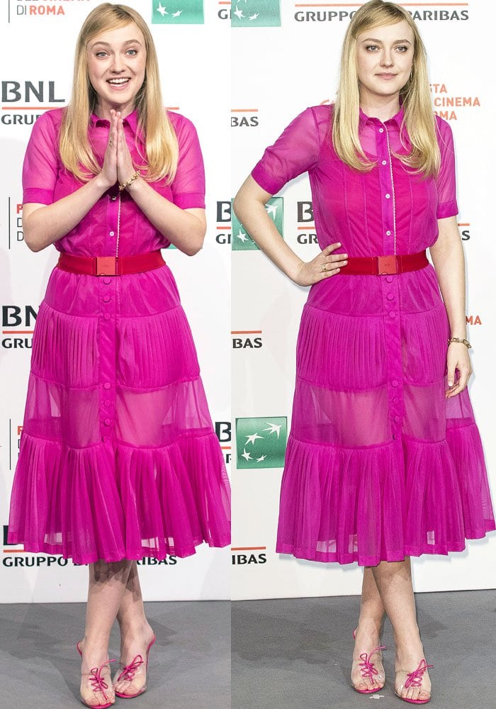 Dakota looks like she raided Elle Woods’ “Legally Blonde” wardrobe, opting for an all-pink organza look from No. 21. A pink sheer shirt was seamlessly attached to a pleated skirt to make the outfit look like a dress. A red belt pulled both pieces together.