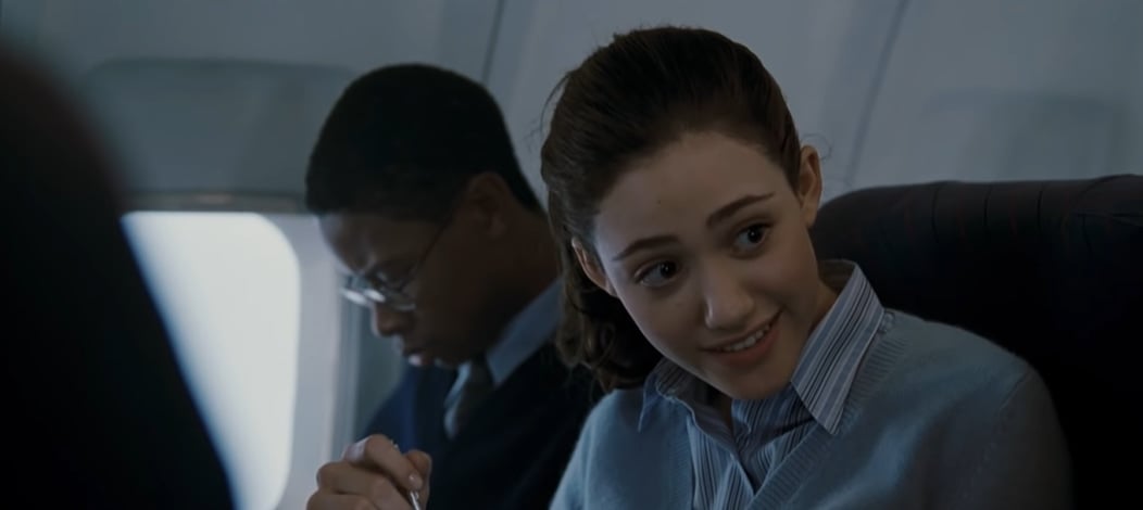 Emmy Rossum as Laura Chapman in The Day After Tomorrow during a scene where she shares a conversation aboard a plane (Credit: 20th Century Fox)