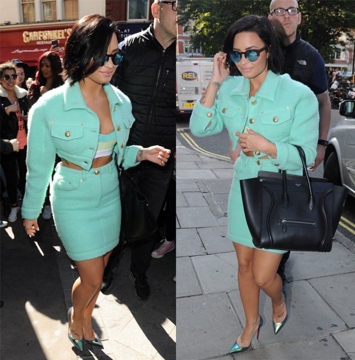 The “Confident” singer wowed in a Moschino Pre-Fall 2015 twin set that she wore with a bustier top, a pair of Christian Louboutin “Iriza” pumps, a pair of Woodys Barcelona “Hiroto” sunglasses, and the same Celine bag.