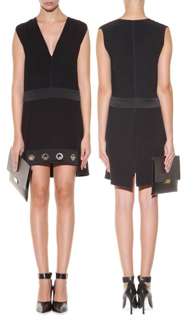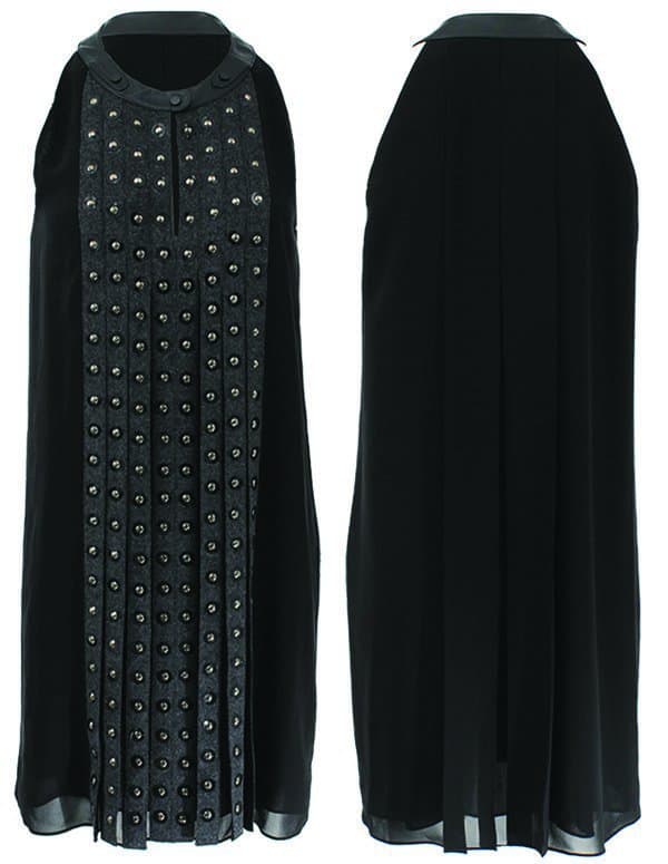 Demi’s dress isn’t actually embellished with grommets, but it creates that impression through circular cutouts framing the rounded studs along the slashed front panels.