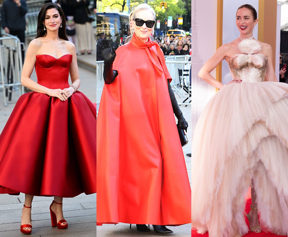 Staying true to the film’s signature style, Streep and Hathaway both went all-in on bold red looks that perfectly matched the movie’s signature palette. Streep kept things sharp and polished with pointed black Stuart Weitzman boots, while Hathaway went full glam in custom Louis Vuitton heels.