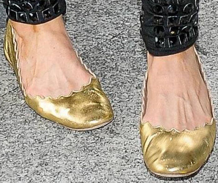 Paris coupled her custom made sequin top with a pair of embellished black jeans, a white tote and a pair of gold Chloé “Lauren” scalloped ballet flats.