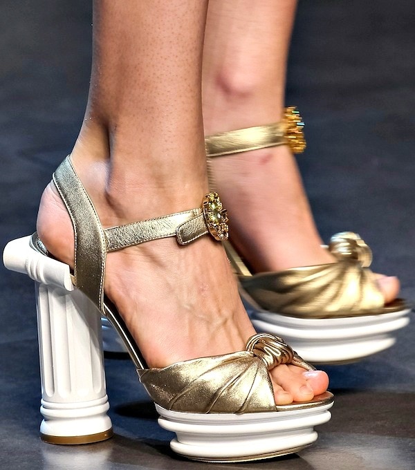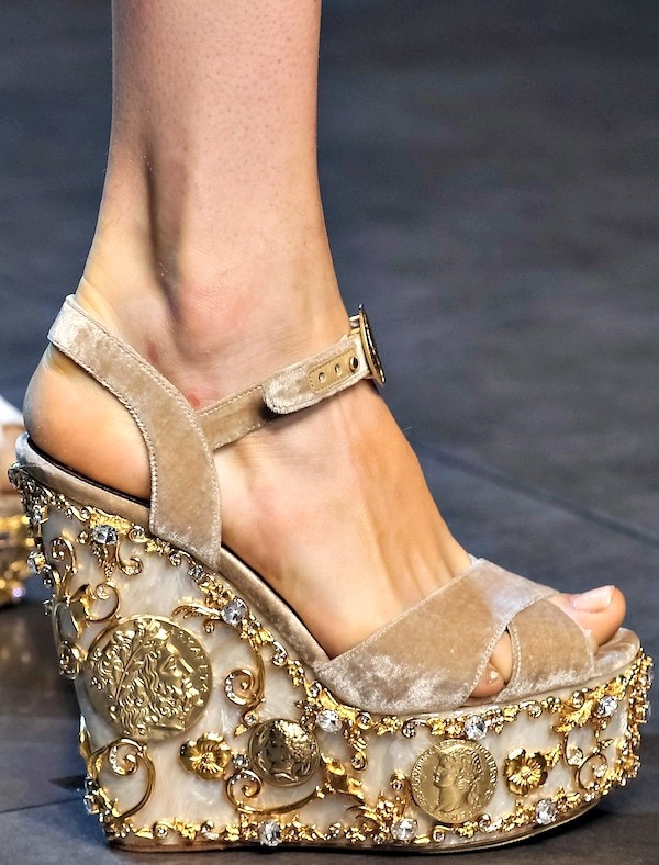 The shoes from Dolce & Gabbana’s latest collection are remarkable works of art. Some standout pieces include shoes with Doric column heels, Grecian sandals, and fabulous wedges with intricate details and jeweled embellishments.