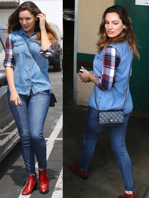 Moreover, the jeans fit Kelly like a glove. Cropped skinny jeans work great when trying out the double denim look because, unlike their loose counterparts, they provide a more petite silhouette.