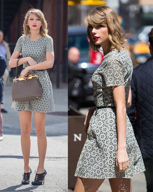 But while the country crooner changes company so often, she’s adamant about sticking to her vintage style. Taylor was dressed to the nines, even for a shopping day. She had on a vintage-inspired fit-and-flare dress with a flower-like pattern.