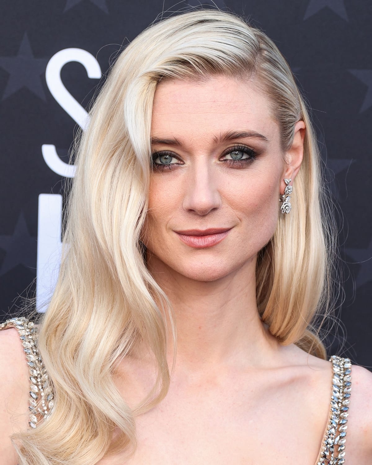 Elizabeth completed her ensemble with a carefully curated, bronzed eye palette, allowing her luscious blonde locks to cascade freely over her shoulders.