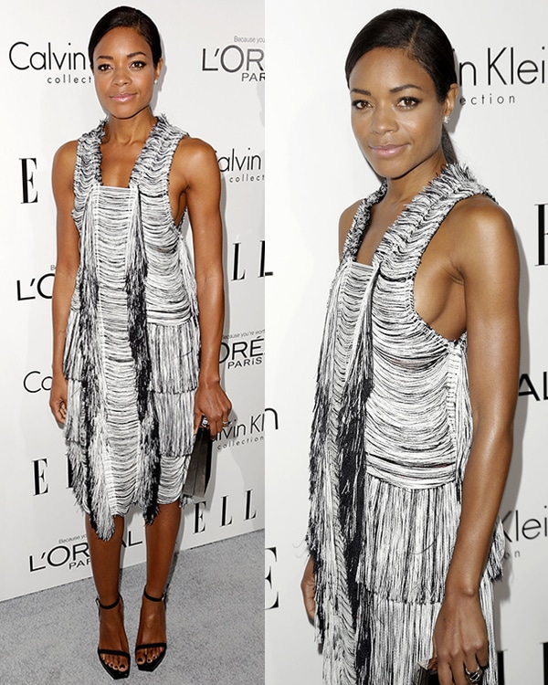 Naomie Harris also showed up in a shapeless fringed Calvin Klein dress. The 37-year-old actress finished her look with black squared-toe sandals.