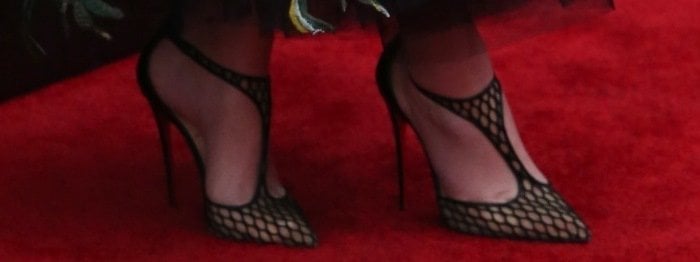 She completed the outfit with a stunning pair of “Salonu” fishnet pumps by Christian Louboutin.