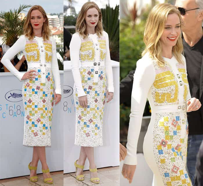 It resembles what Emily Blunt wore at the Cannes Film Festival a few months back. Although they’re not the same dress, they’re very similar.