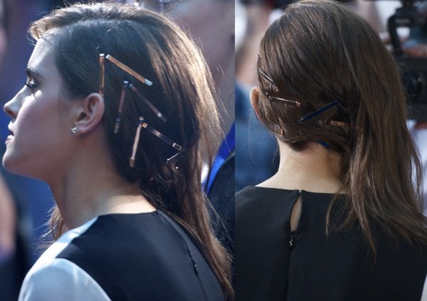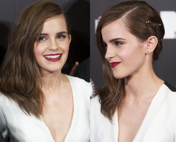 Emma finished her look with a cool side-swept hairstyle, a gold cuff, and dark berry lips, which provided an edge to her sleek and sophisticated ensemble.