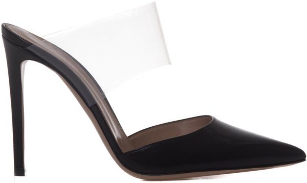 The then-23-year-old actress wore the leather-and-PVC slip-ons from Gianvito Rossi, which feature pointy toes, wide PVC straps, an open back, black leather, and high stiletto heels.