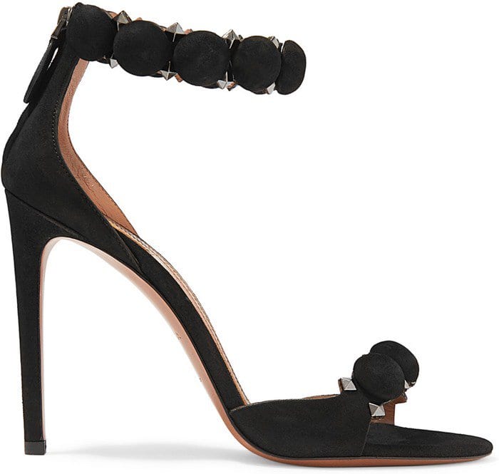 These heels, true to Alaïa’s signature style, feature intricate details like buttons and pyramid studs adorning the toe and ankle straps, elevating the overall look.