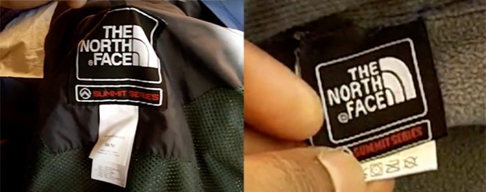 Authentic jackets sport front tags that are more vivid, the stitching denser, and the spaces between the letters that spell out the brand are consistent in size.