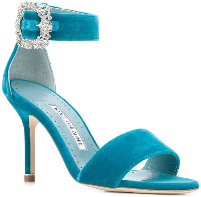This elegant satin sandal will take you through the event season in style with an ankle strap with a side buckle fastening, a Swarovski crystal buckle, an open toe, a branded insole, a leather sole, and a stiletto heel.