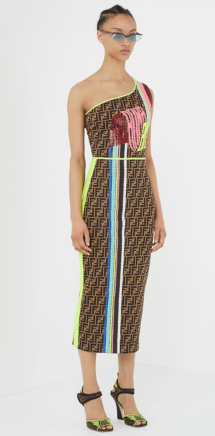 The Chilling Adventures of Sabrina star flashed her legs in a sheath-cut midi dress from Fendi’s Roma Amor Collection featuring a single-shouldered neckline.