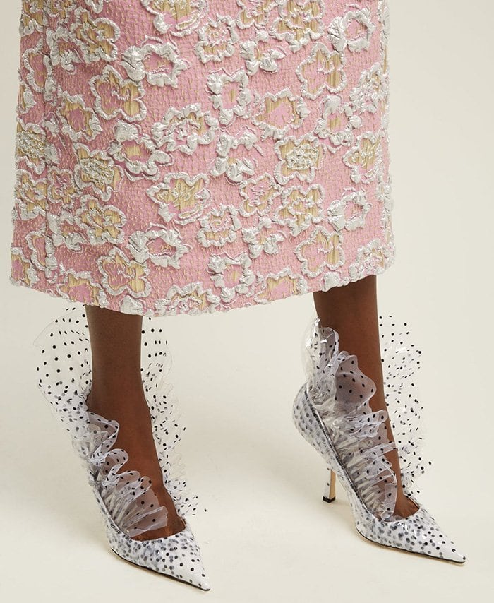 The unique, playful pumps are covered with polka-dotted tulle and clear PVC, featuring the same polka-dotted tulle and PVC ruffles along the topline.