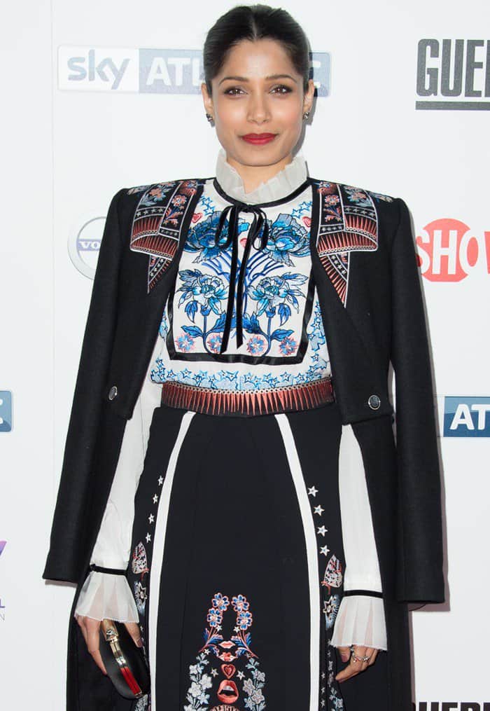 In April 2017, Freida Pinto joined director John Ridley and co-star Babou Ceesay at their Emmy: For Your Consideration screening of ‘Guerrilla’ at The WGA Theater in Beverly Hills, California. She plays Jas Mitra, the lead in the politically charged six-part British drama miniseries.