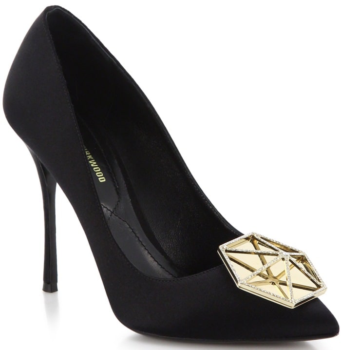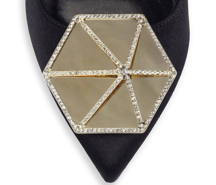 Jessica’s glittering pumps at the screening can be found at Farfetch. They feature 2.75″ (70mm) self-covered heels and geometric metal jewels.
