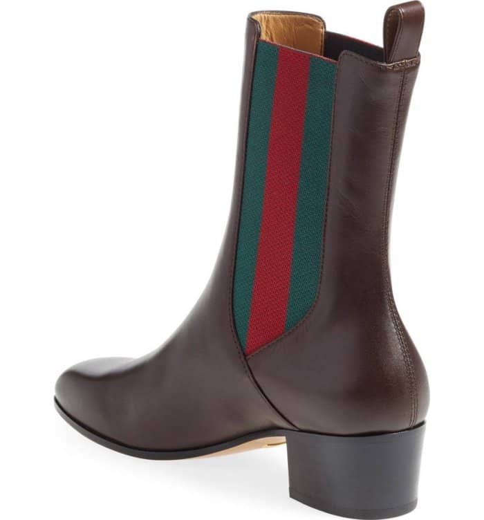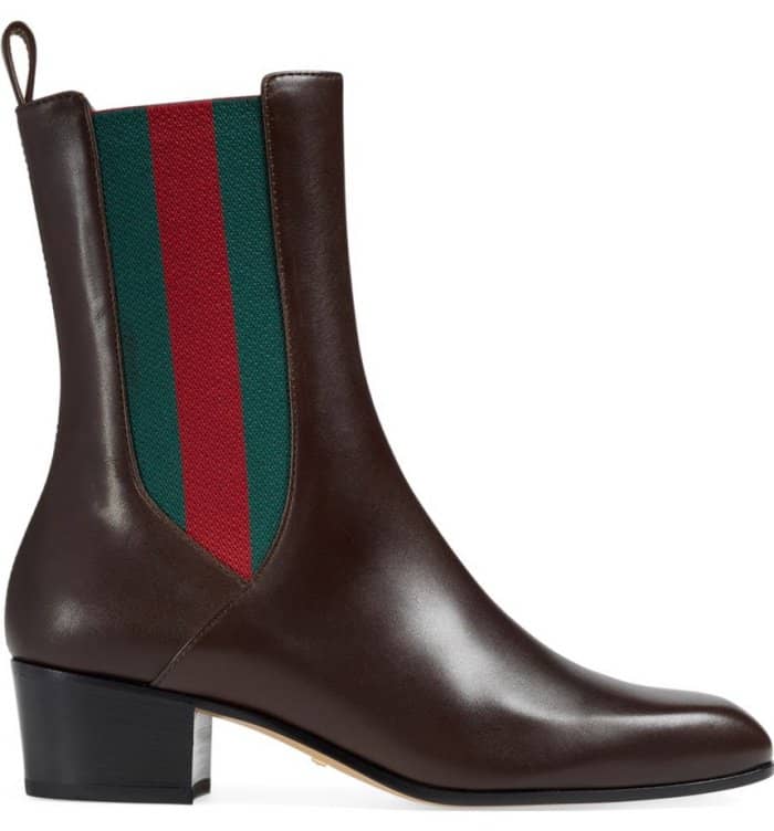 Gemma wore the “Karen” slip-on booties from Gucci, which feature structured leather and web elastic inserts. They also have square toes, stacked block heels, rear pull tabs, and leather lining. In addition, these shoes feature leather soles and the luxury brand’s signature stripes along the elastic sides. You can get your own pair for $980 at Net-A-Porter and Nordstrom.