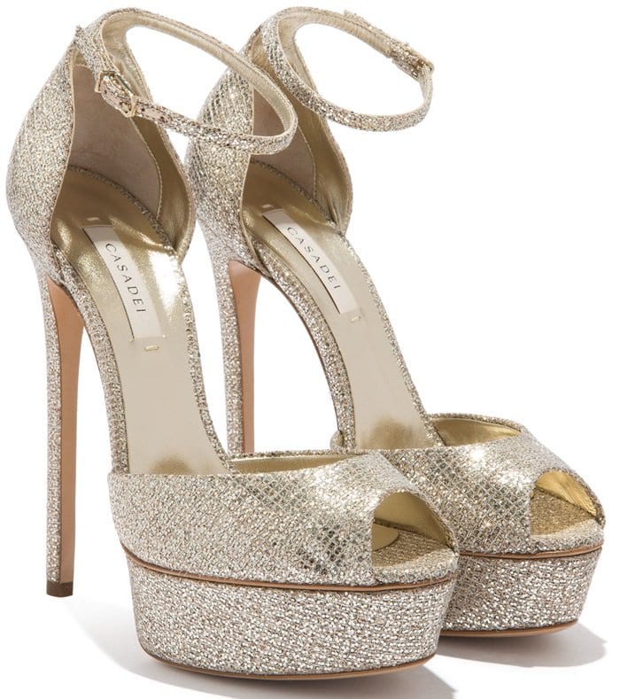 Anne’s platinum glitter Casadei peep-toe platforms were also available in silver.