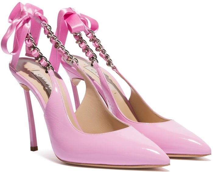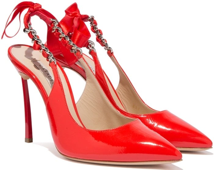 She happily showed off her bright red patent leather Kelly slingback heels boasting the iconic “Blade” heel and chain decoration.