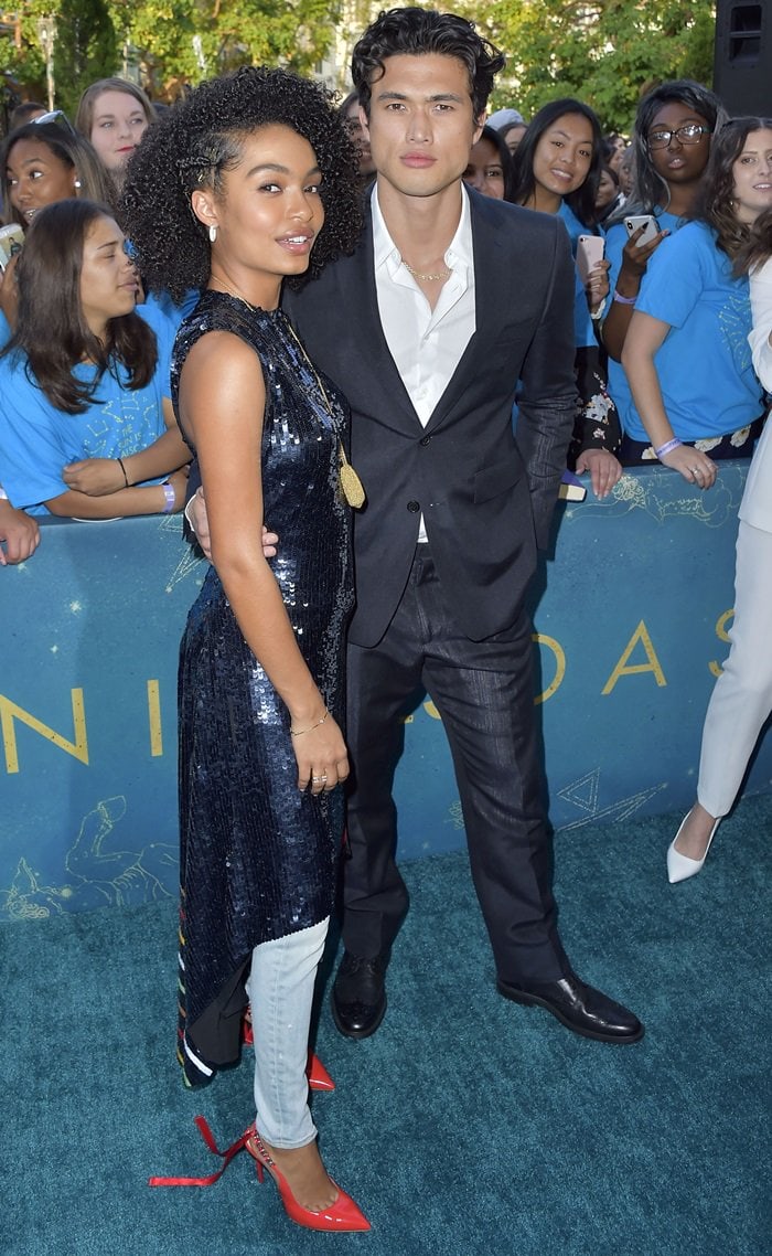 One month earlier, Yara hit the blue carpet for The Sun is Also a Star premiere at The Grove in Los Angeles. She donned a blue, sparkling Monse Fall 2019 dress over light-wash jeans. Her look was completed with neon coral Blade Kelly pumps from Casadei with ribbon and chain strap.
