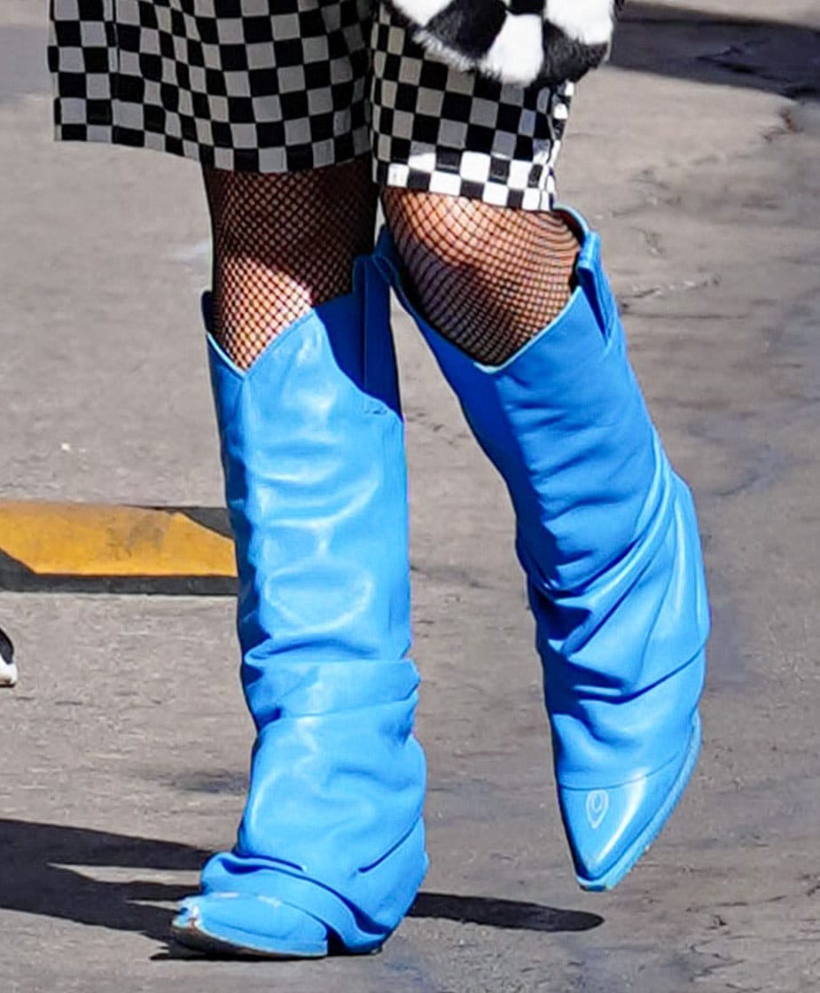 Gwen then wore a pair of fishnet stockings and bright blue Western boots, which gave her monochromatic black-and-white look a pop of color.