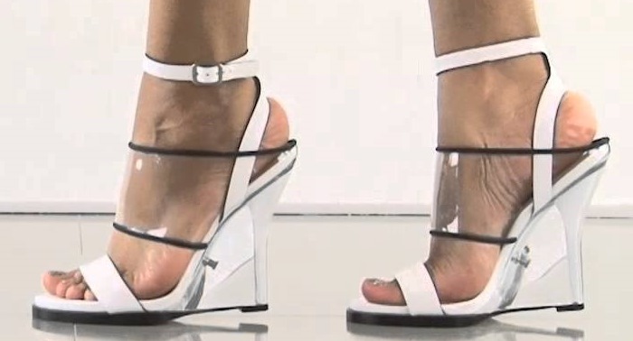 Close-up of Gwen Stefani’s L.A.M.B. “Fiby” sandals featuring leather front straps, clear vinyl midstraps, and four-inch translucent wedge heels (Credit: WENN)