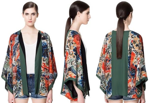 The piece is actually from Zara. We have yet to confirm if it’s made of silk, but it looks like it. It features contrasting green panels at the sleeves, open front, and center back. It’s great for layering and can be worn across seasons. Below is a closer look at the kimono for you.