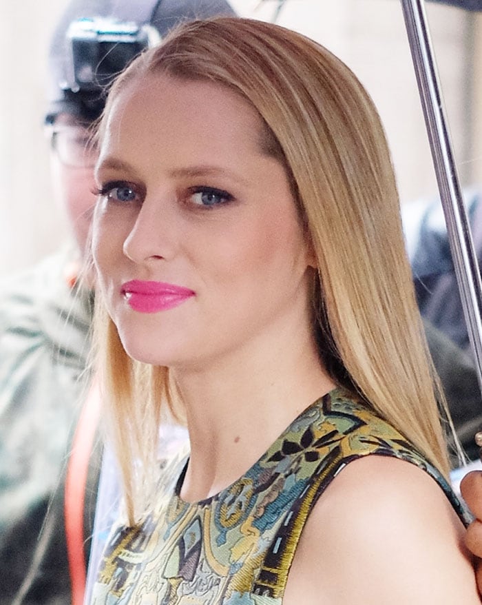 The “Warm Bodies” actress styled the busy outfit with minimal accessories but added a contrasting pop of color to the ensemble with light blue heels.