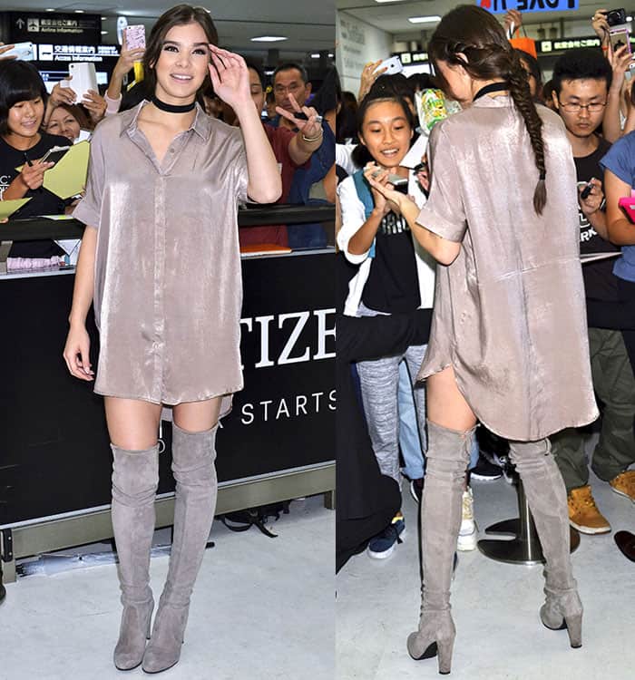 Hailee slipped into a pair of over-the-knee boots, called “Highland” by Stuart Weitzman. These gray stretch-suede thigh-high boots feature drawstring ties at the back, paneled stitching and about four-inch block heels.