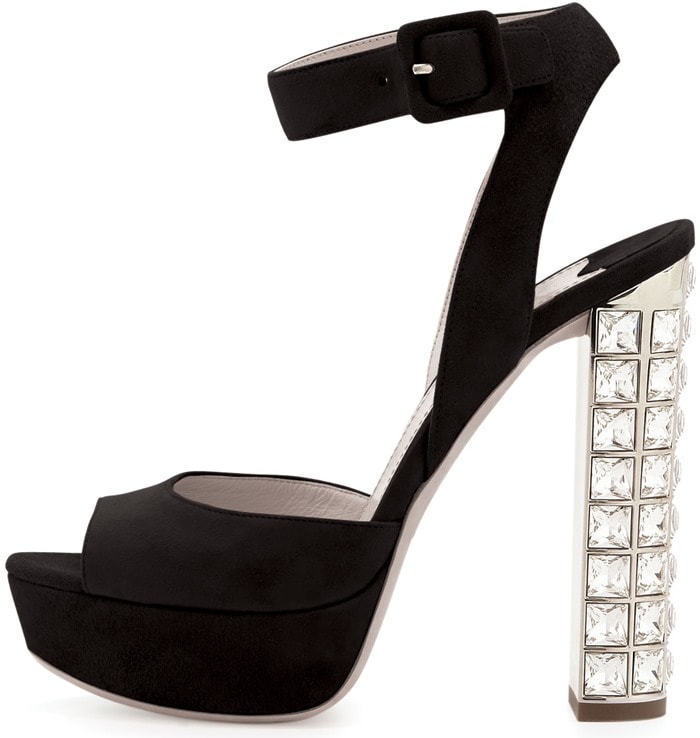 The open-toe Miu Miu sandals feature adjustable ankle straps, posted slingback straps, and crystal-inlaid silver heels. They are available in black suede at Neiman Marcus.